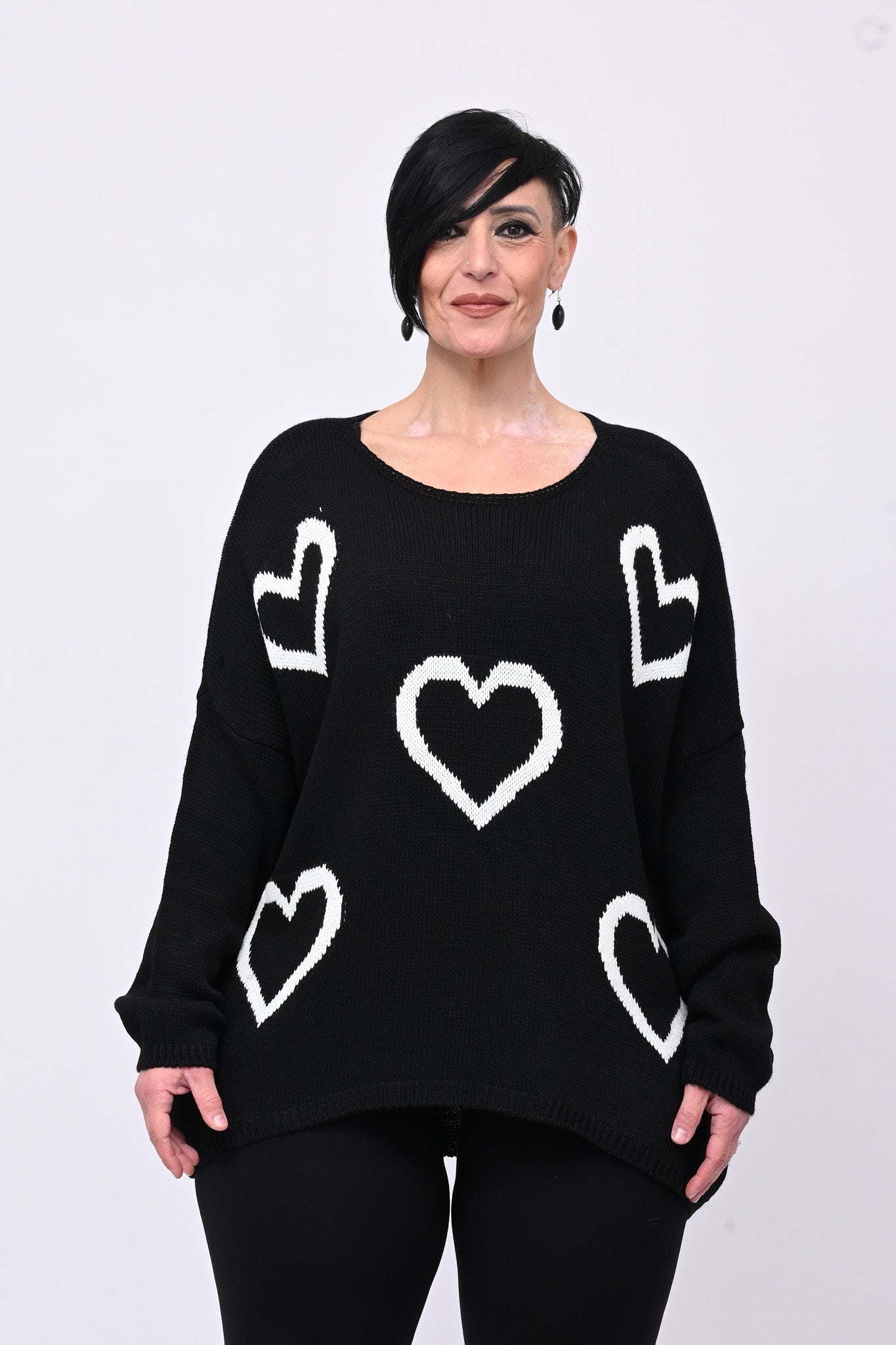 Maxi pull, girocollo e silhouette fluida con fondo arrotondato sul davanti e più lungo dietro. I grandi cuori stampati aggiungono un tocco di personalità e originalità. Pratico e versatile è ideale per creare look casual e easy chic.