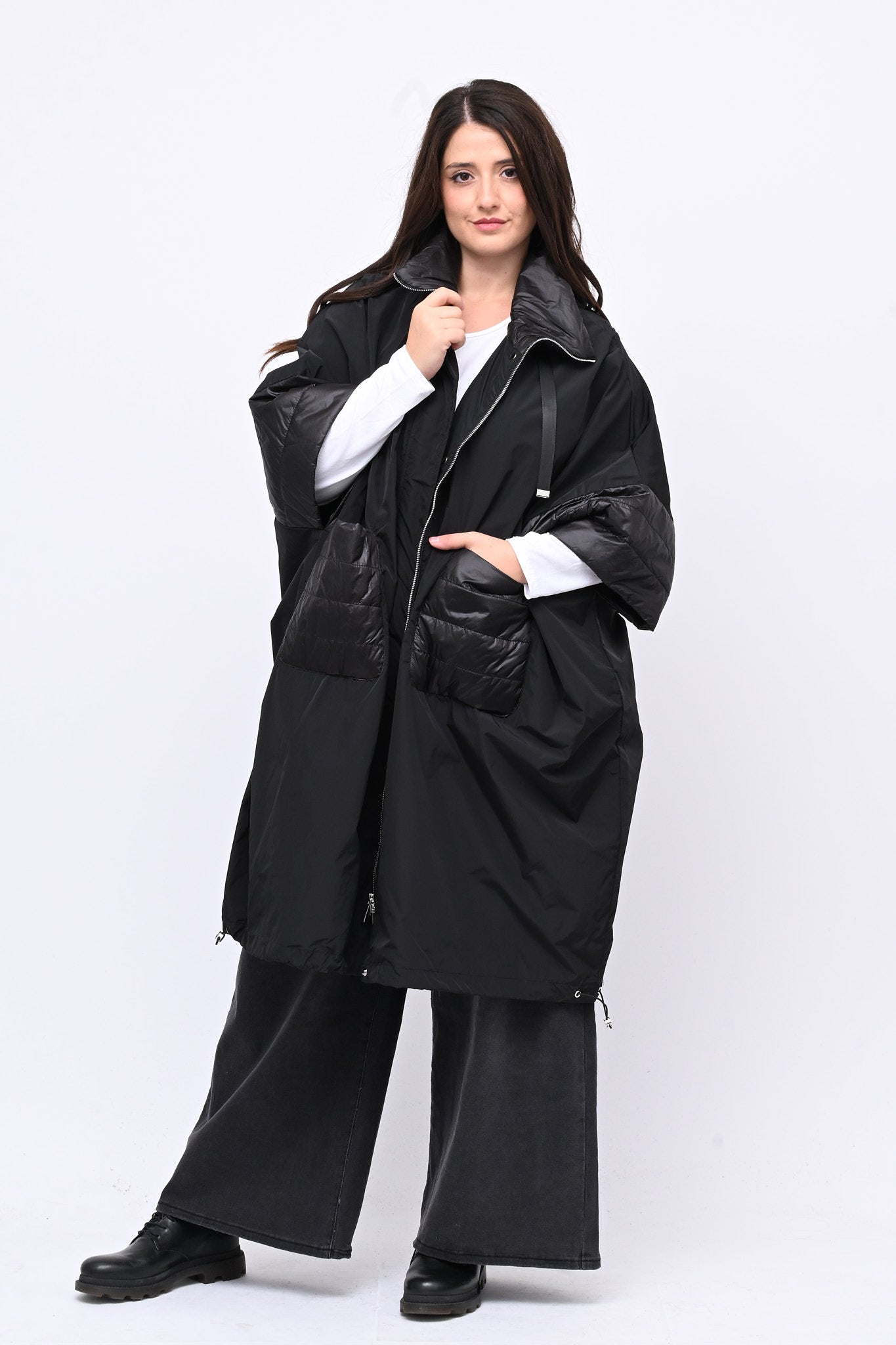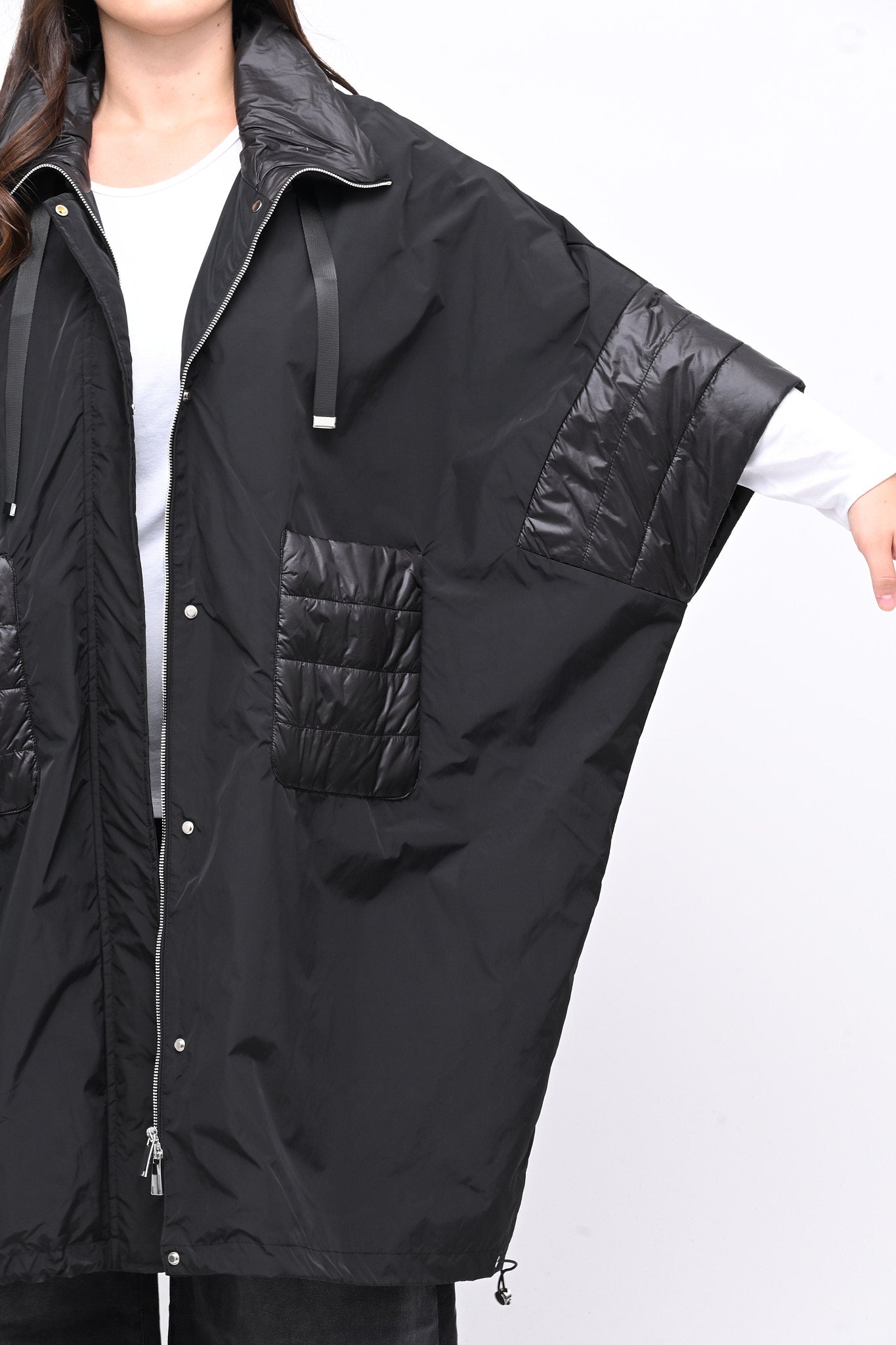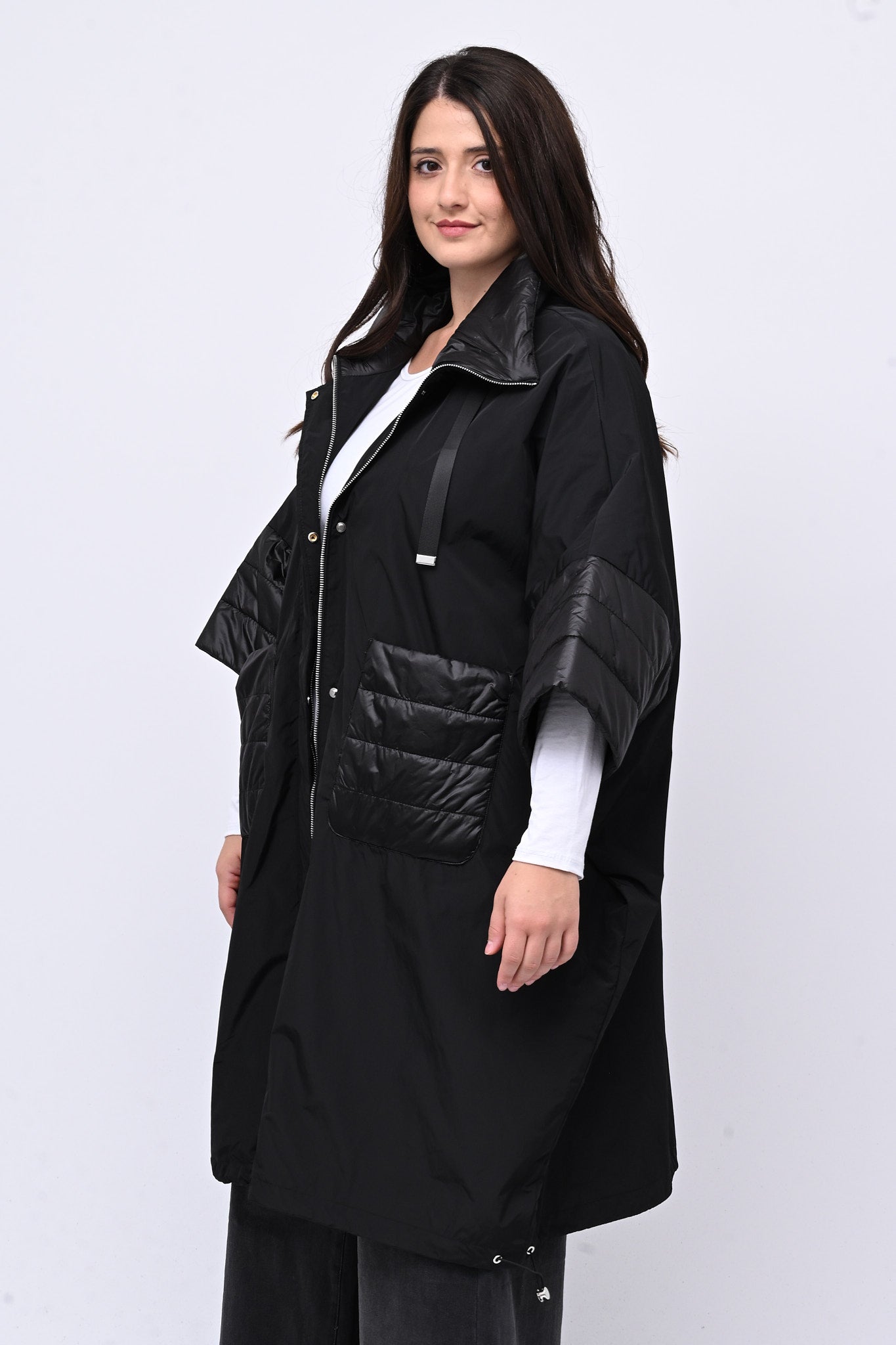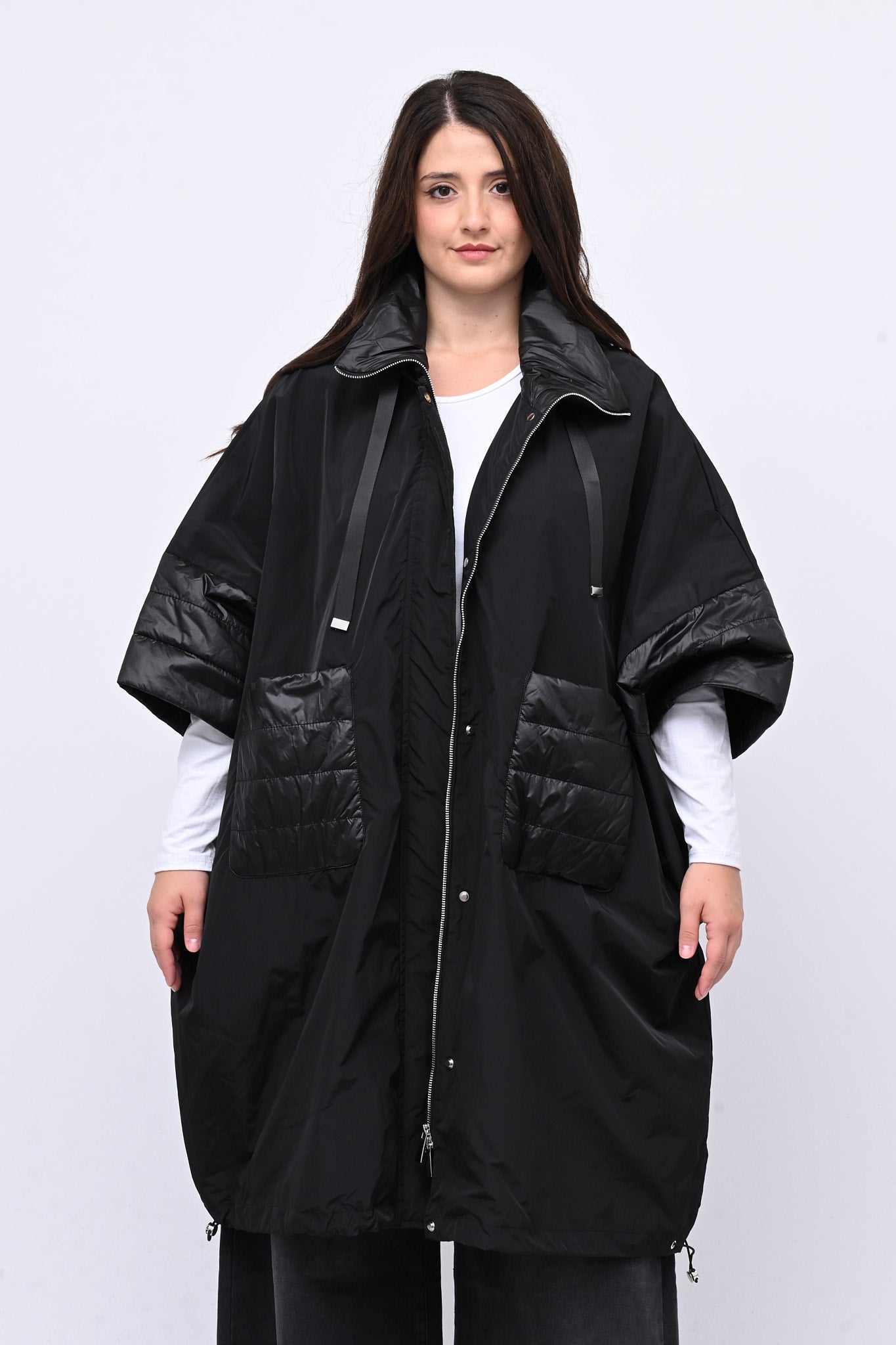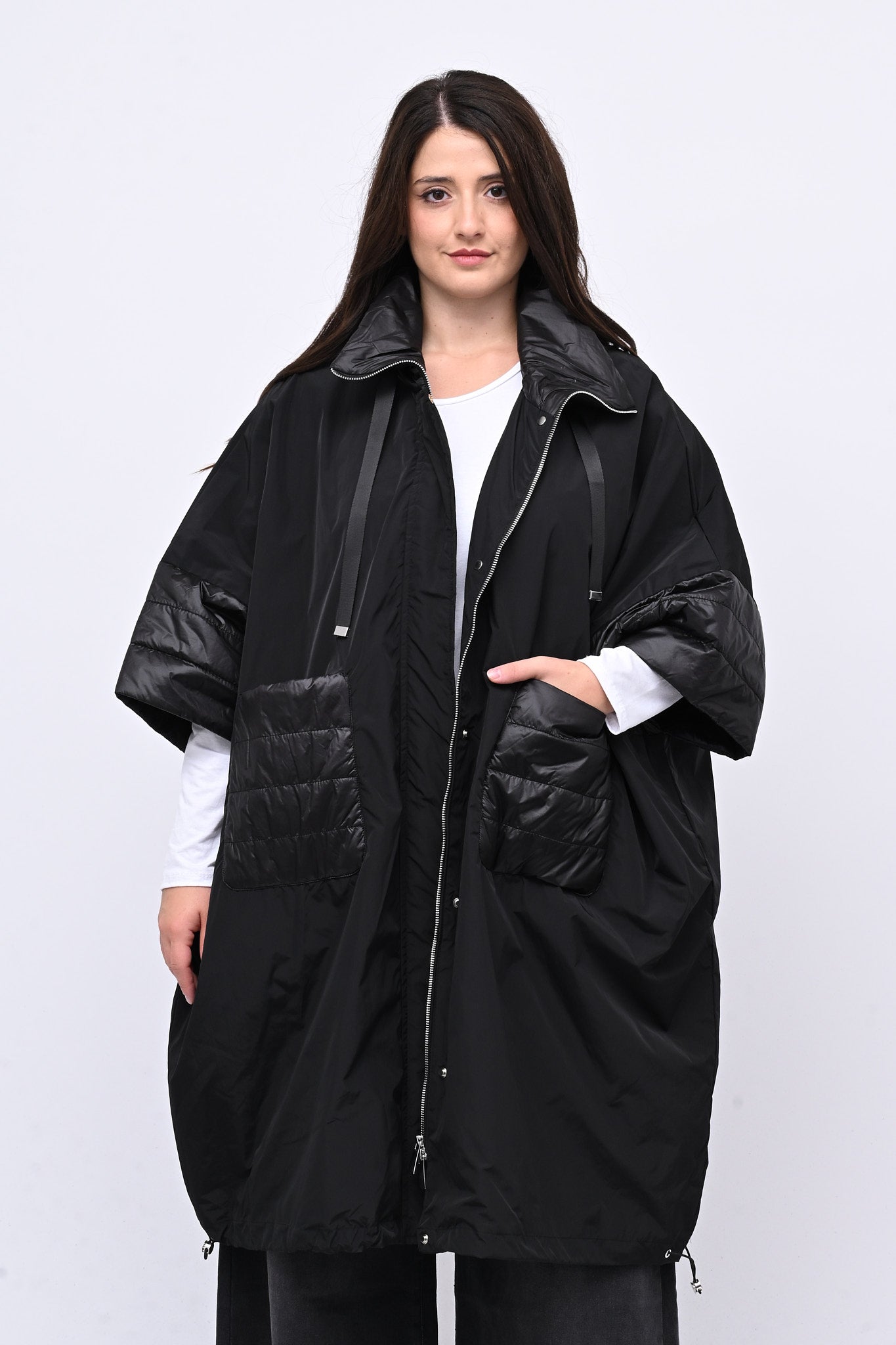 Mantella tecnica a ovetto e manica 3/4. Dotata di zip e automatici, presenta inserti in piumino che garantiscono calore e leggerezza. Perfetta per chi cerca un capo versatile dal tocco sofisticato, funzionale e dallo stile urbano.