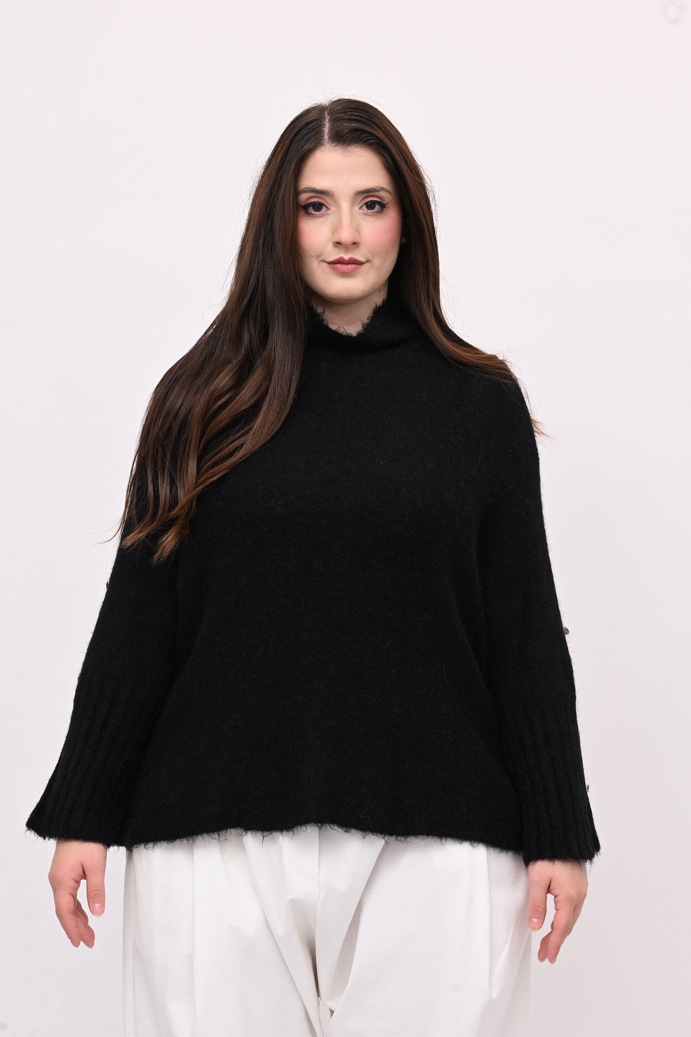 Pull in tessuto misto alpaca, collo a lupetto, spalla scesa e manica lunga a coste. Modello a scatoletta, vestibilità rilassata e femminile, dalla silhouette moderna e femminile. Perfetto per outfit casual e raffinati, garantisce calore, leggerezza, e comfort.
